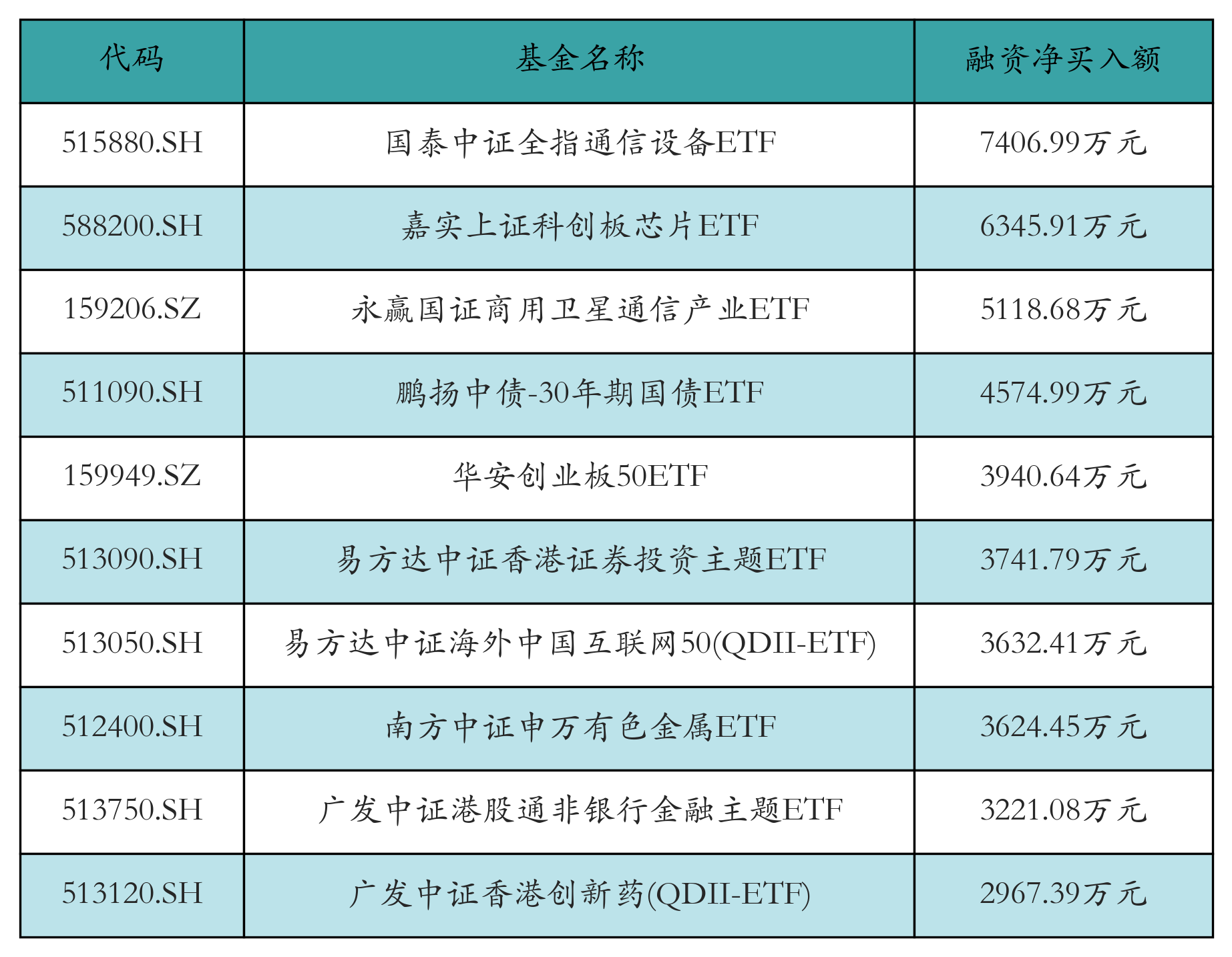 12月8日ETF融资净买入额前三位分别为:国泰中证全指通信设备ETF(7406.99万元)、嘉实上证科创板芯片ETF(6345.91万元)和永赢国证商用卫星通信产业ETF(5118.68万元),前10具体见下表: