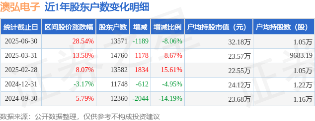 从股价来看,2025年3月31日至2025年6月30日,澳弘电子区间涨幅为28.54%,在此期间股东户数减少1189.0户,减幅为8.06%。