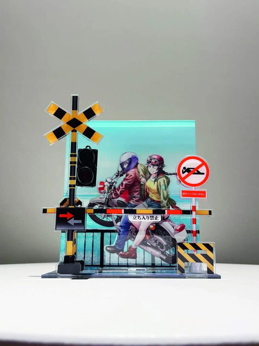 说着张主任向我们展示了最近她满意的搭配,“是人狼村之谜的双人立牌,搭配了日本海边铁道的场景谷美。图上,立体的信号灯正闪烁着光,黑黄红配色的横杆与“禁止入内”的警示牌竖立在蔚蓝背景板前,一对男女并肩坐在摩托车上,阳光洒在他们脸庞,朝着镜头露出旅行出发前的笑容,像是驱散了之前所有的阴霾,带着结局才有的轻松与释然,仿佛下一秒就会沿着海边公路一路远行,迎着海风去看更广阔的风景。原来谷子还能这么玩,难道谷圈也要考研?我们不禁发出和网友一样的赞叹,老师!求链接!