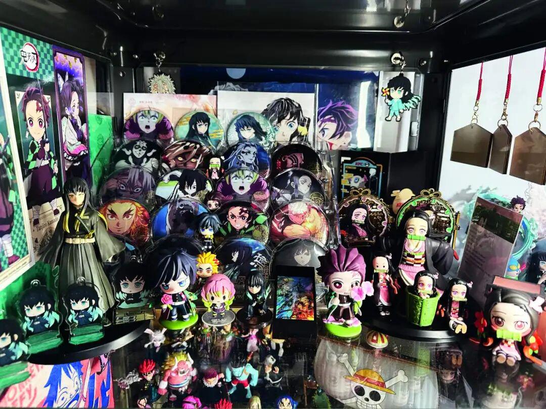 亚克力立牌按角色阵营排列,吧唧用专用展示框分类陈列,连灯光角度都精心调试,只为让谷子在最佳状态下“亮相”。